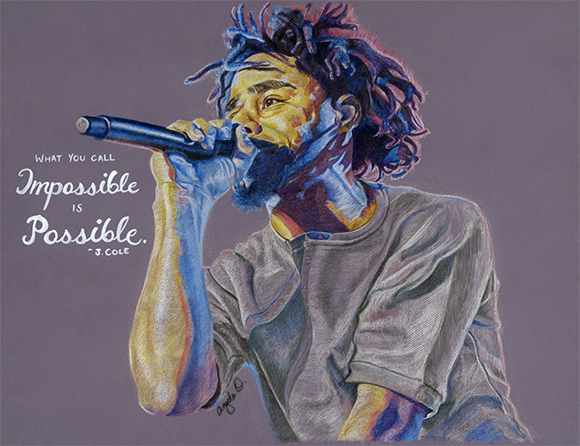 Portrait of the music artist J. Cole featuring lyrics from his song “Song for the Ville.”