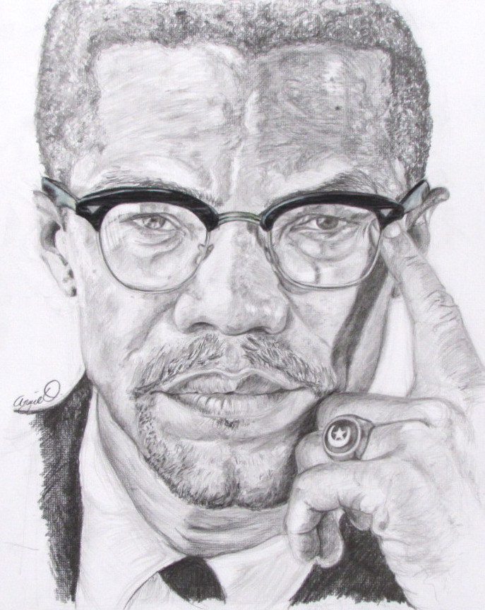 Commissioned portrait of Malcolm X with a custom quote.Graphite pencil and colored pencil on paper.12″ x 17″2015