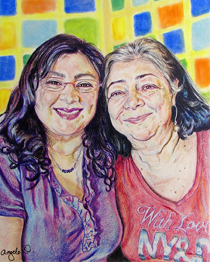 Commissioned portrait of a mom and daughter.Colored pencil and pastel on white illustration board.8″ x 10″2018