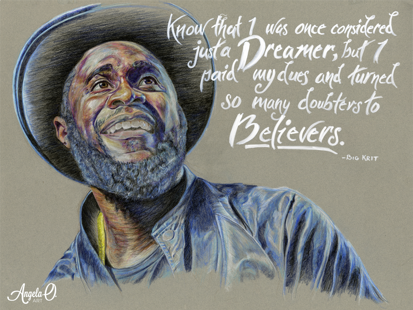 Portrait of the music artist Big KRIT. In the foreground are lyrics from his song “Dreamin’ “.